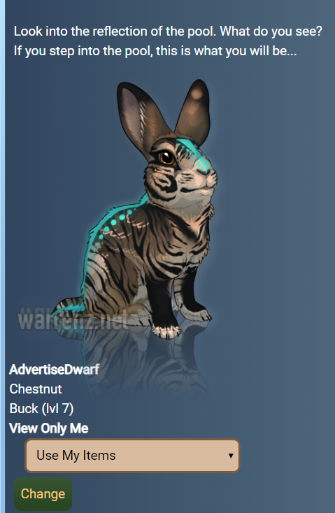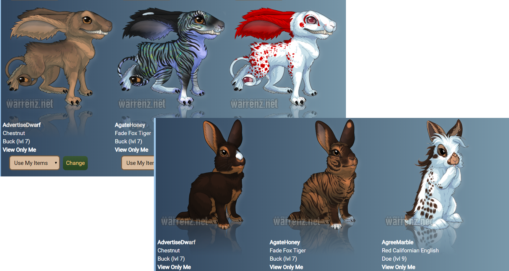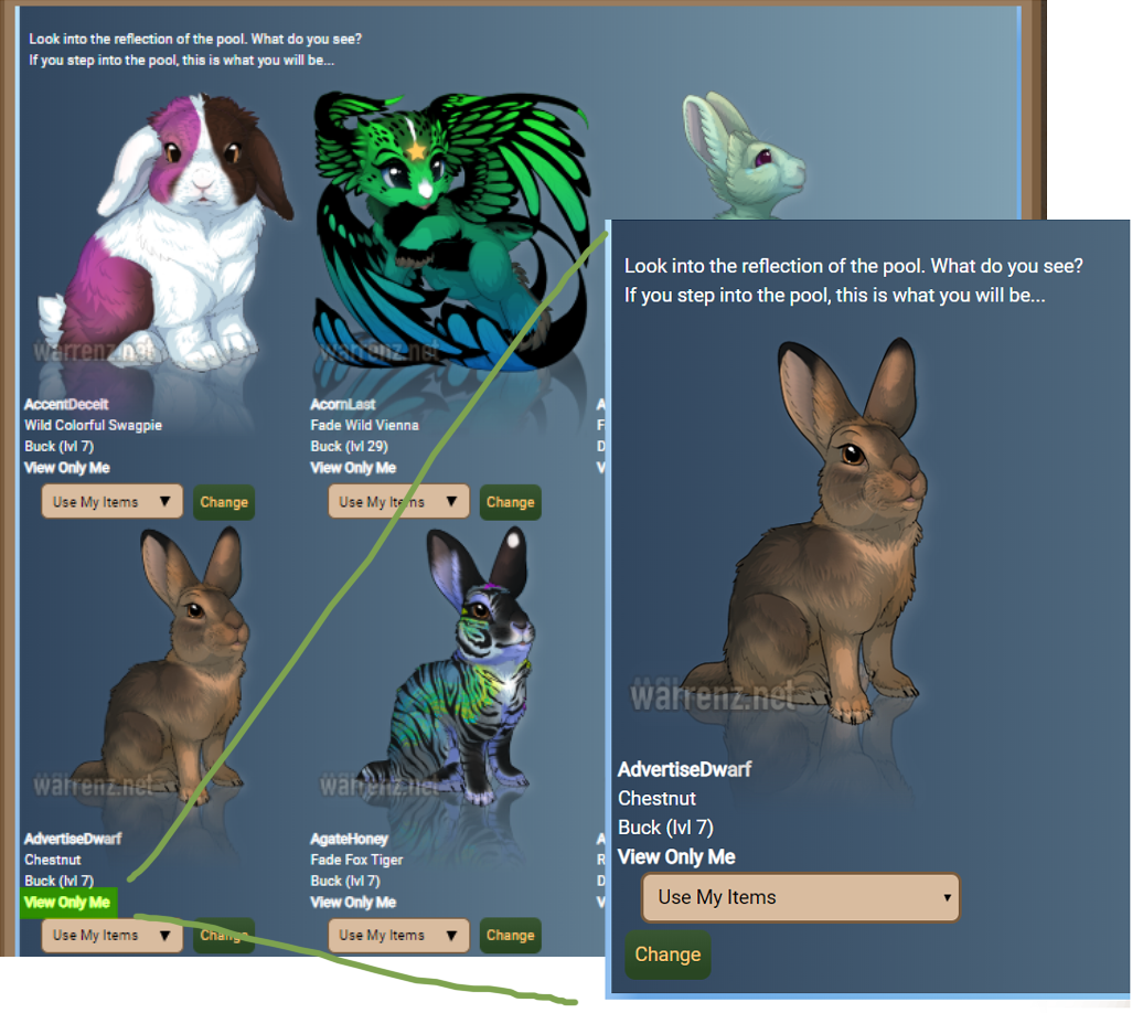 All your rabbits will be previewed with the selected changes and you will be able to change them on the spot with the "Use my items" options in the dropbox menu, if you have the items required, wich are the items you selected on the preview panel.