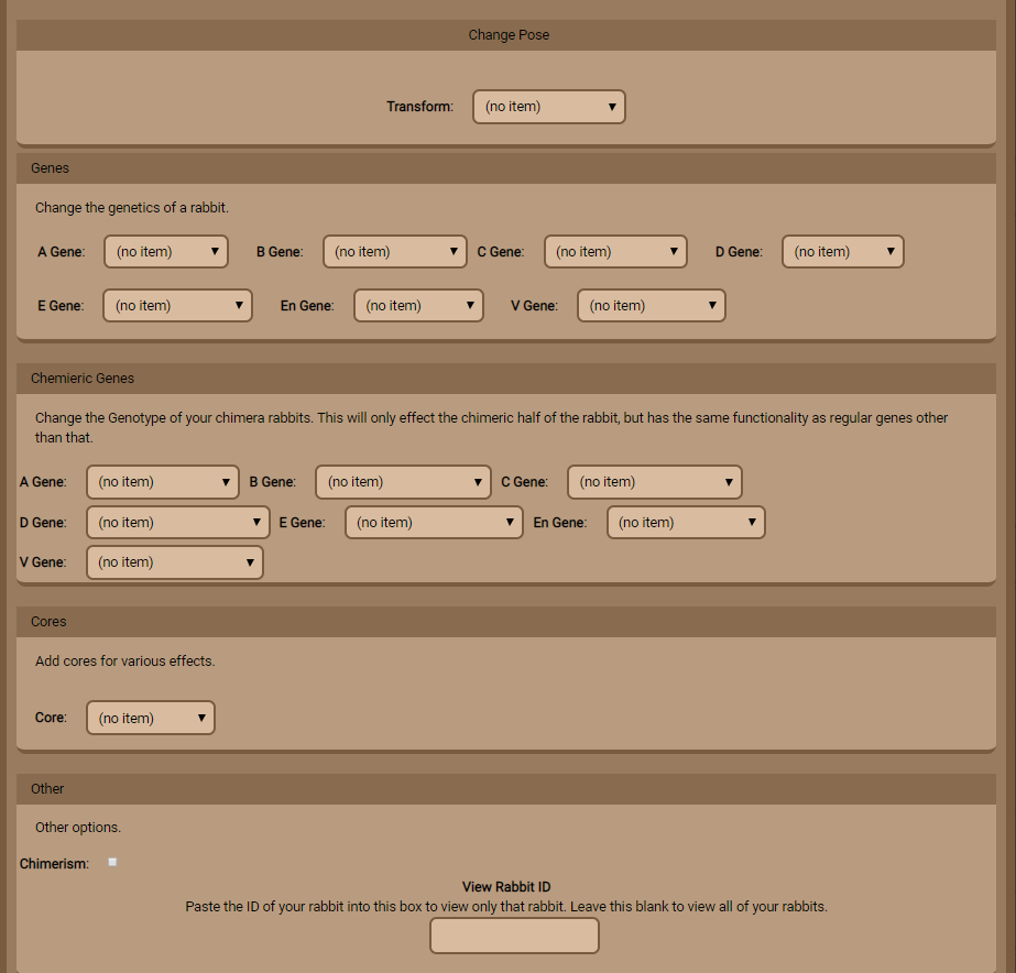 The Chimeric Genes panel allows you to choose new chimeric genes for your rabbits. These are changed by using "Split DNA" instead of the normal DNA. They work exactly like normal DNA, except it only affects the chimera side.