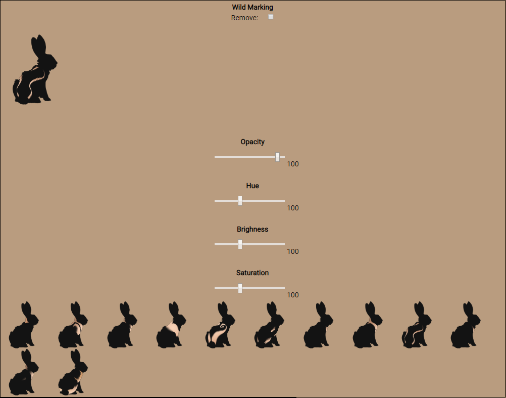 In this example we currently have a wild body marking. So the panel will show the current wild body marking the rabbit has, 4 sliders and all of the markings that are "wild body". The sliders will only work on "wild", spirit, and special markings.More info about the different markings in their sections bellow.